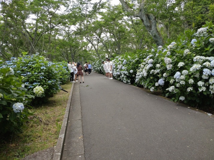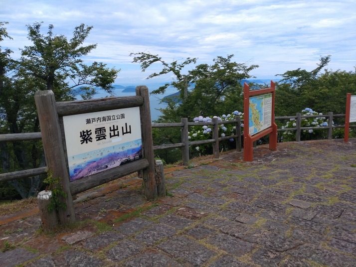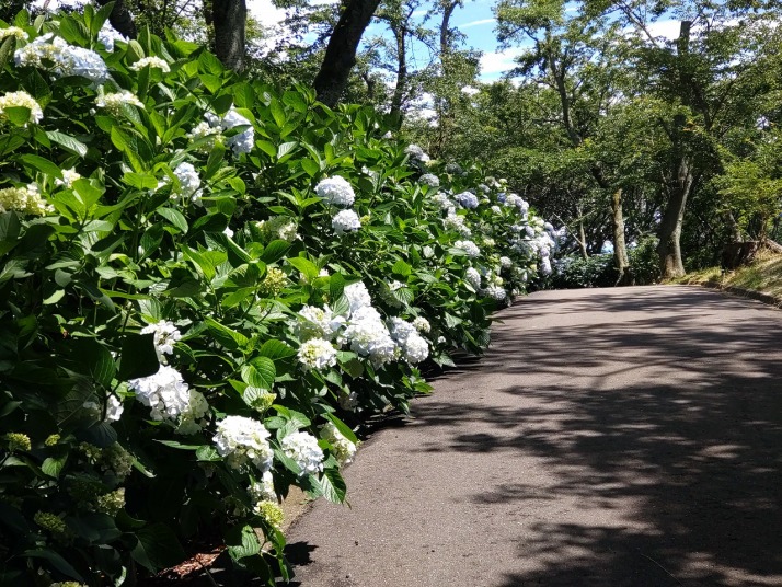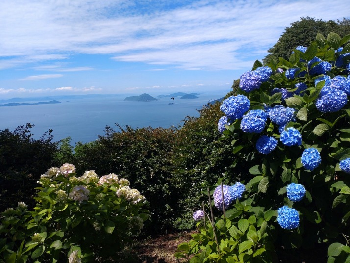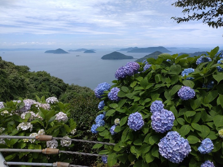 | 桜の見どころ四国一、紫陽花の見どころも四国一との評判のようです。脇町10時出発で詫間港に11時15分到着。前回志々島に行った時に利用した食事処三崎丸に寄りエビフライ定食を食べる。海岸沿いの店で新鮮で安く美味しい。食後紫雲出山へ、紫雲出山道路入口でガードマンに止められて駐車場が一杯だから待機と言われて待つ3台目、見る見る間に20台以上の待ち状態。15分程待つと5台通行出来て山頂駐車場へ。昼一に行ったのが幸いした。天気が回復して多島美と紫陽花と青空の景色を堪能出来、爽やかな風に吹かれて梅雨の合間を楽しんだ。 行動 1時間 距離 1.2 km 歩数 3000 歩 |